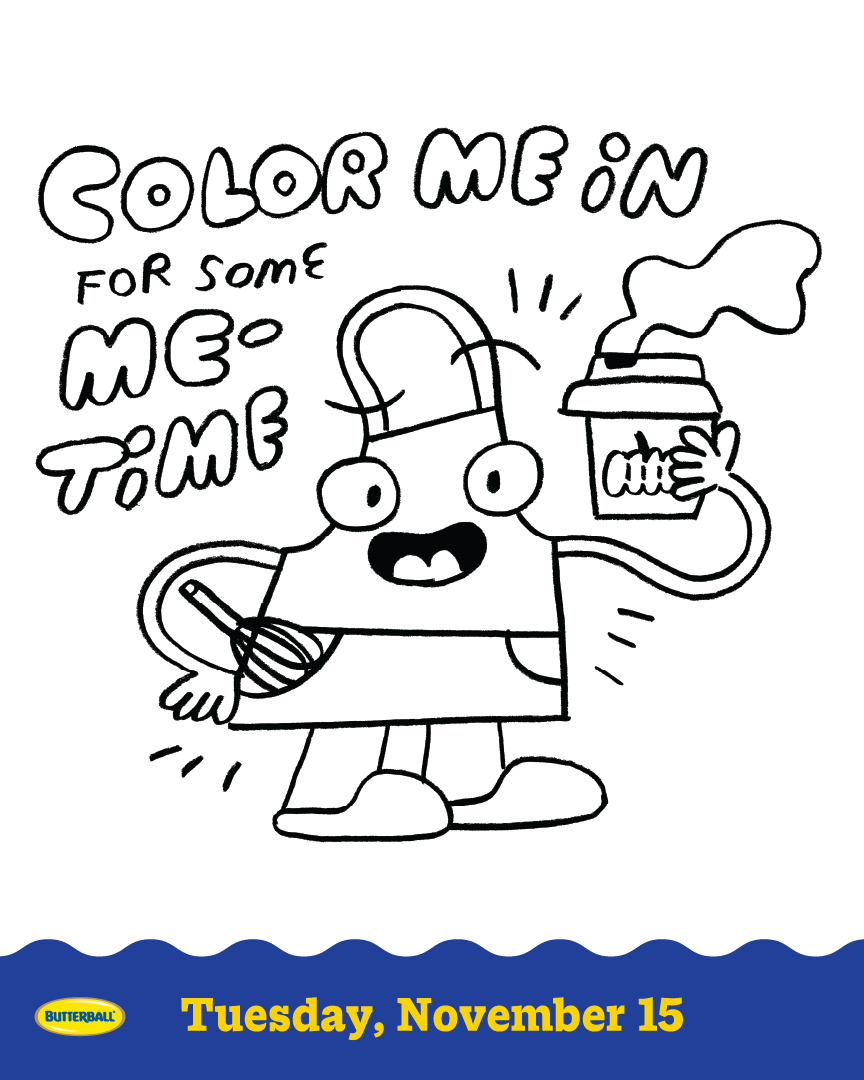 Like any Thanksgiving dinner party, our calendar needed an excellent host. Inspired by classic Butterball blue aprons, the sassy, forever-cozy Apron was born. Each page featured a unique illustration of Apron doing various Thanksgiving-related activities.